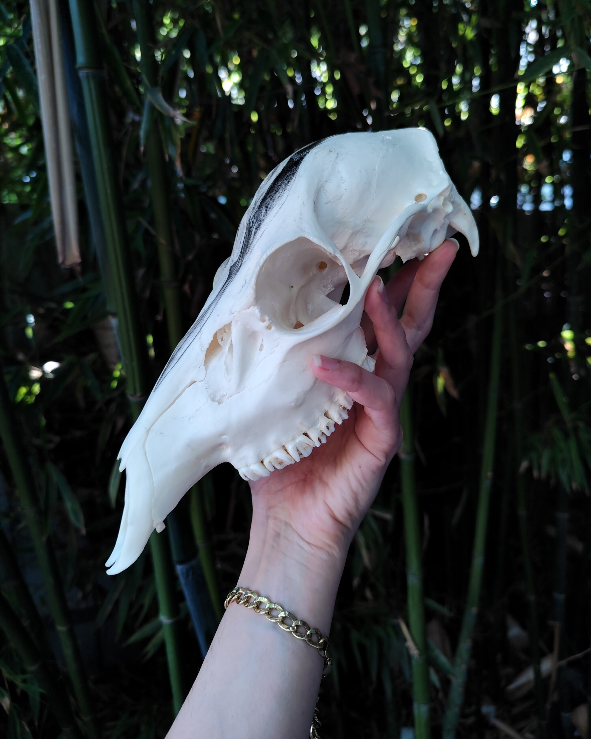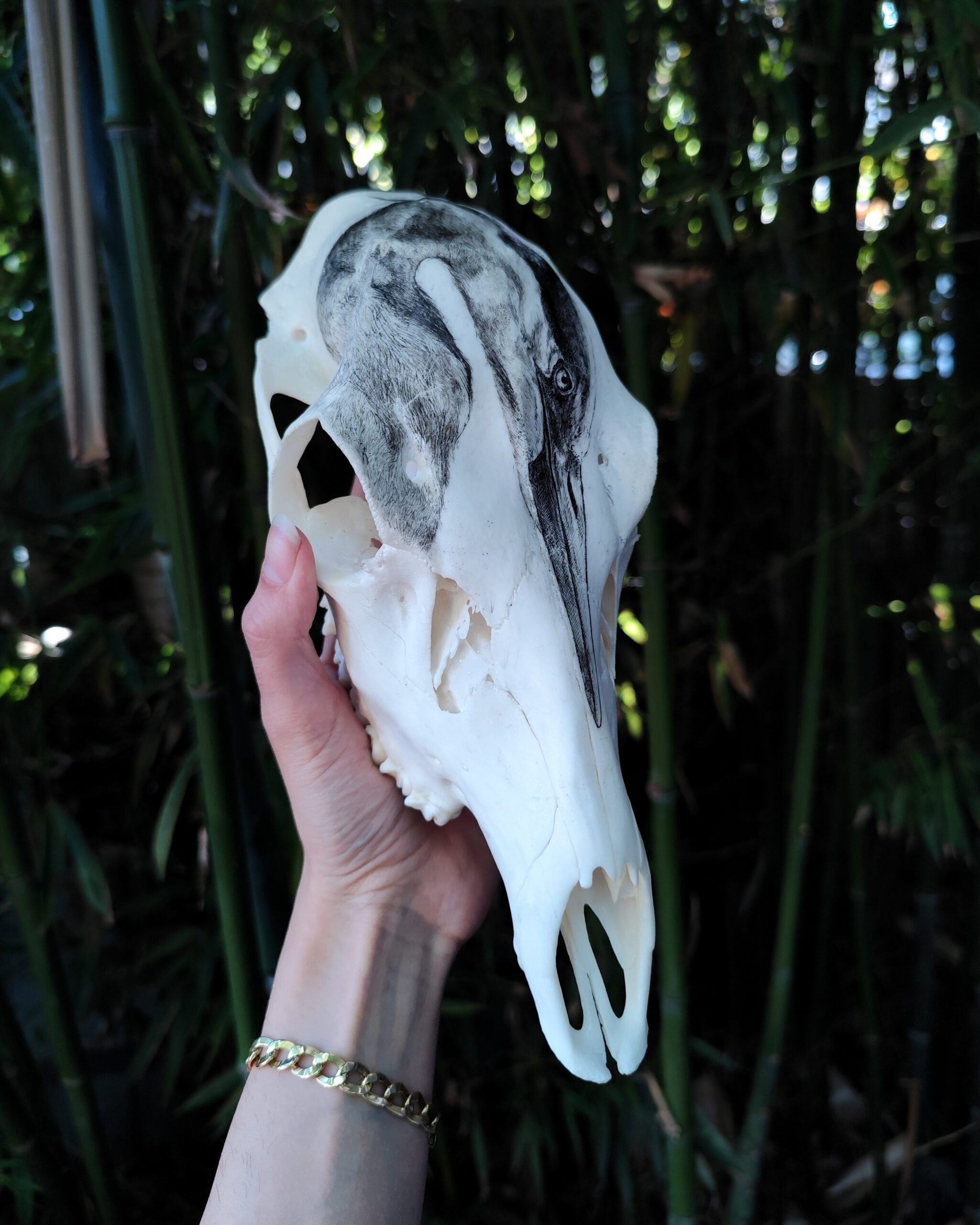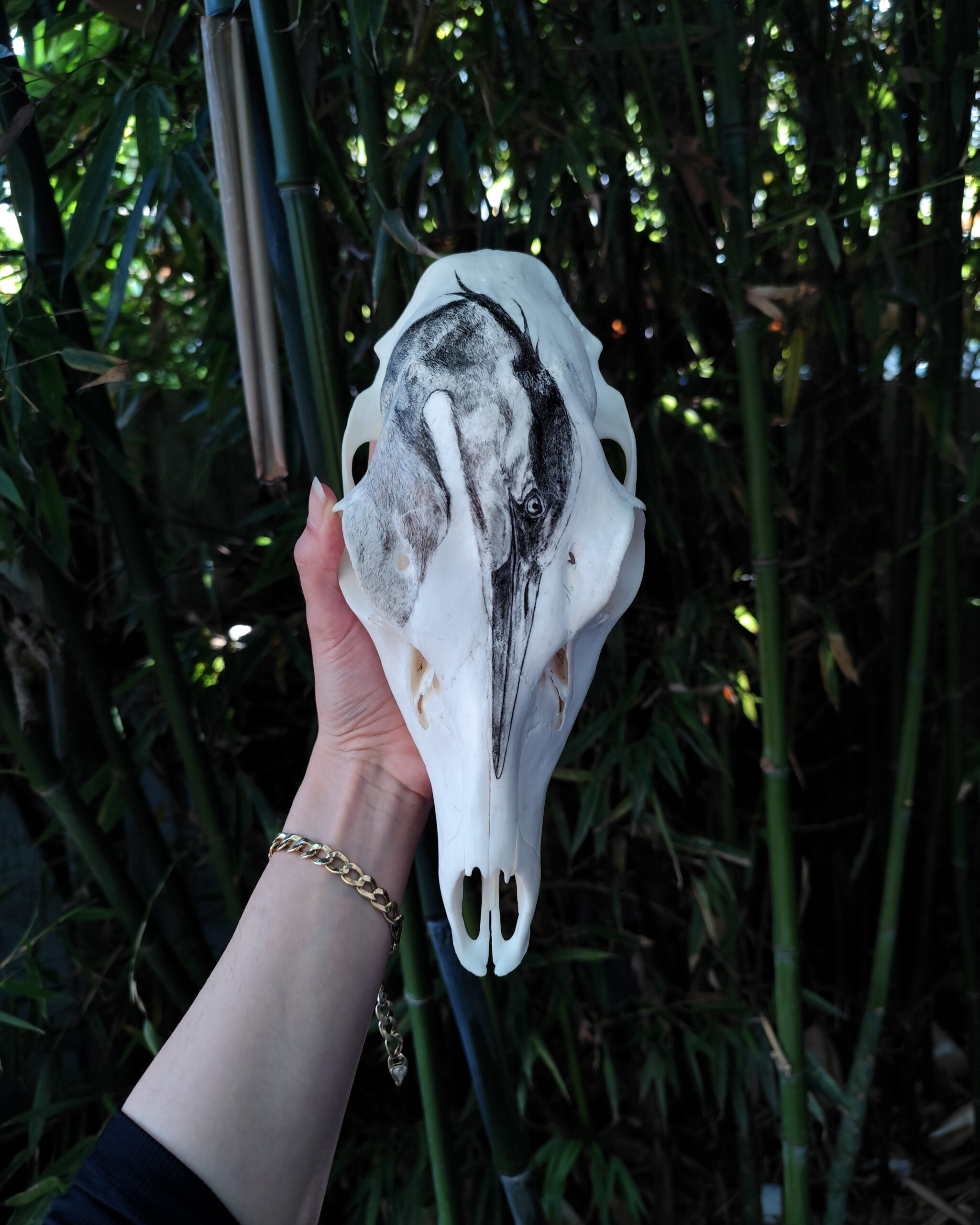 Cranio di giovane daino eticamente recuperato, decorato a mano a inchiostro con airone cenerino.