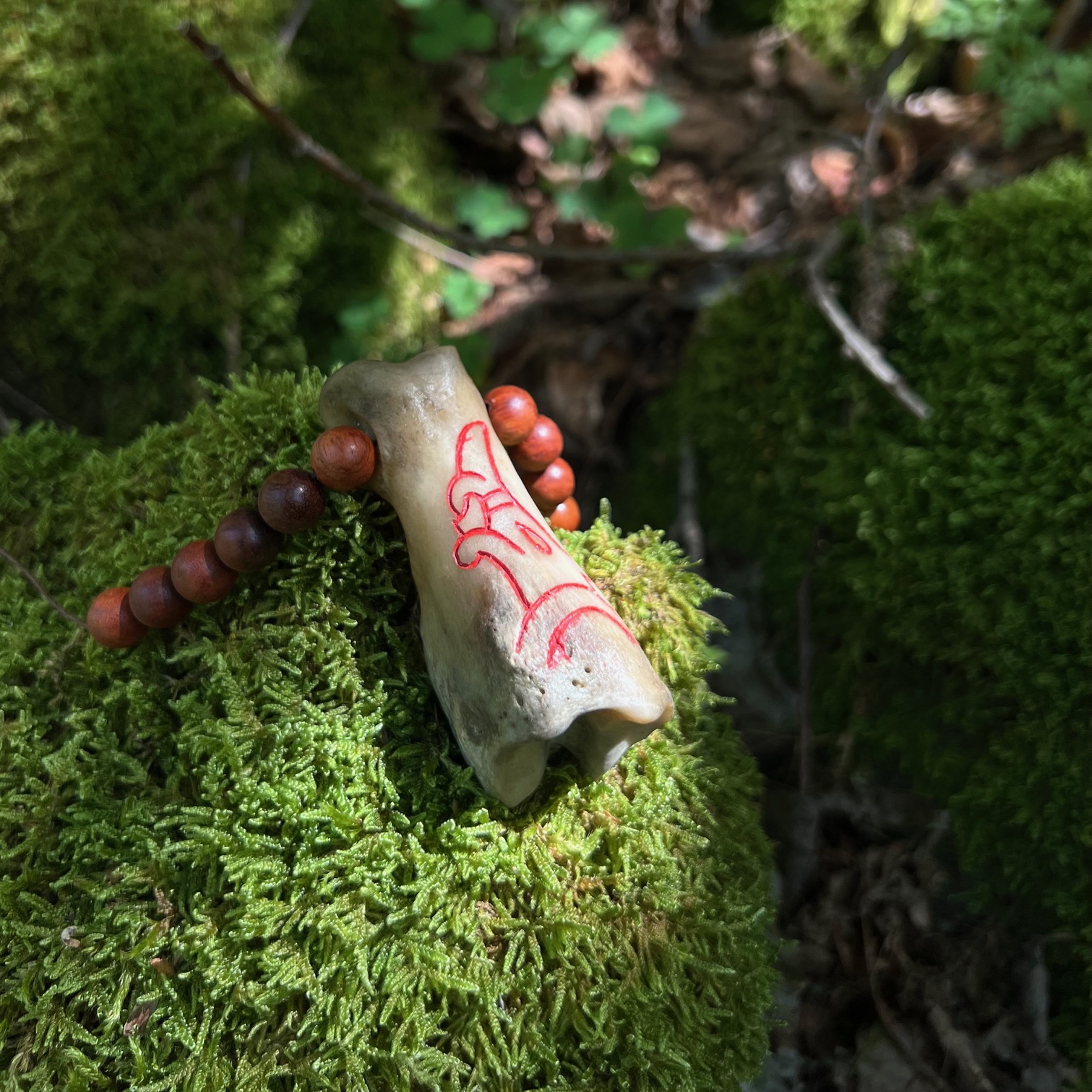 Collana realizzata con la falange di un alce, con drago norreno inciso e dipinto a mano, con perline di legno.